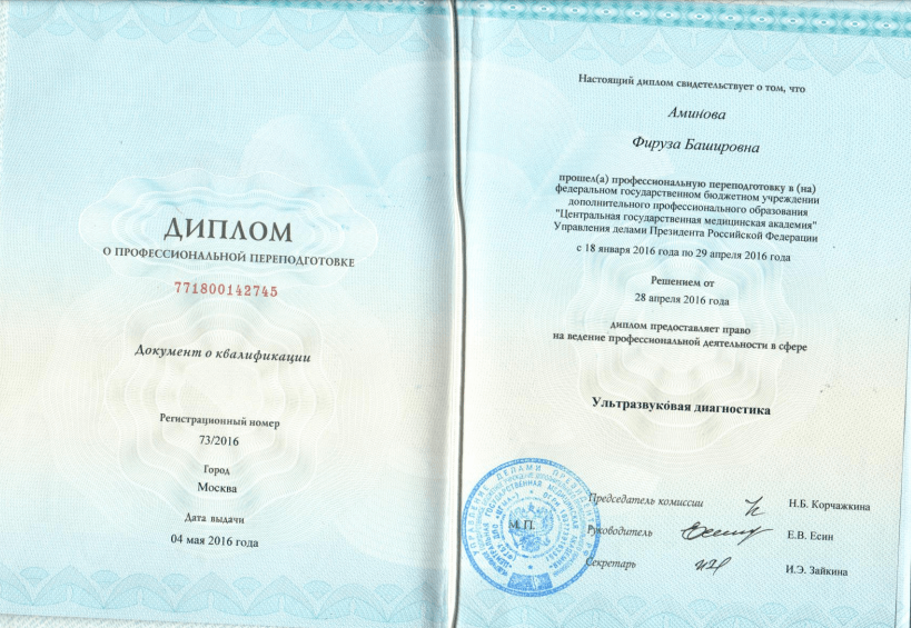 | 2016 г. - Центральная государственная медицинская академия, повышение квалификации по специальности "Ультразвуковая диагностика" |