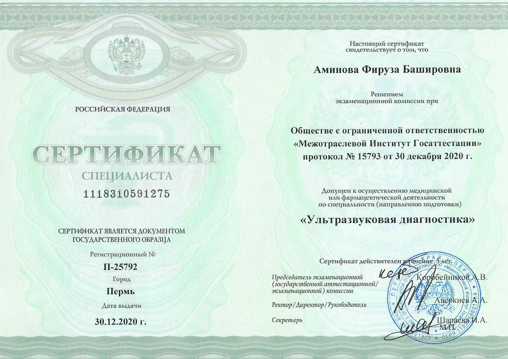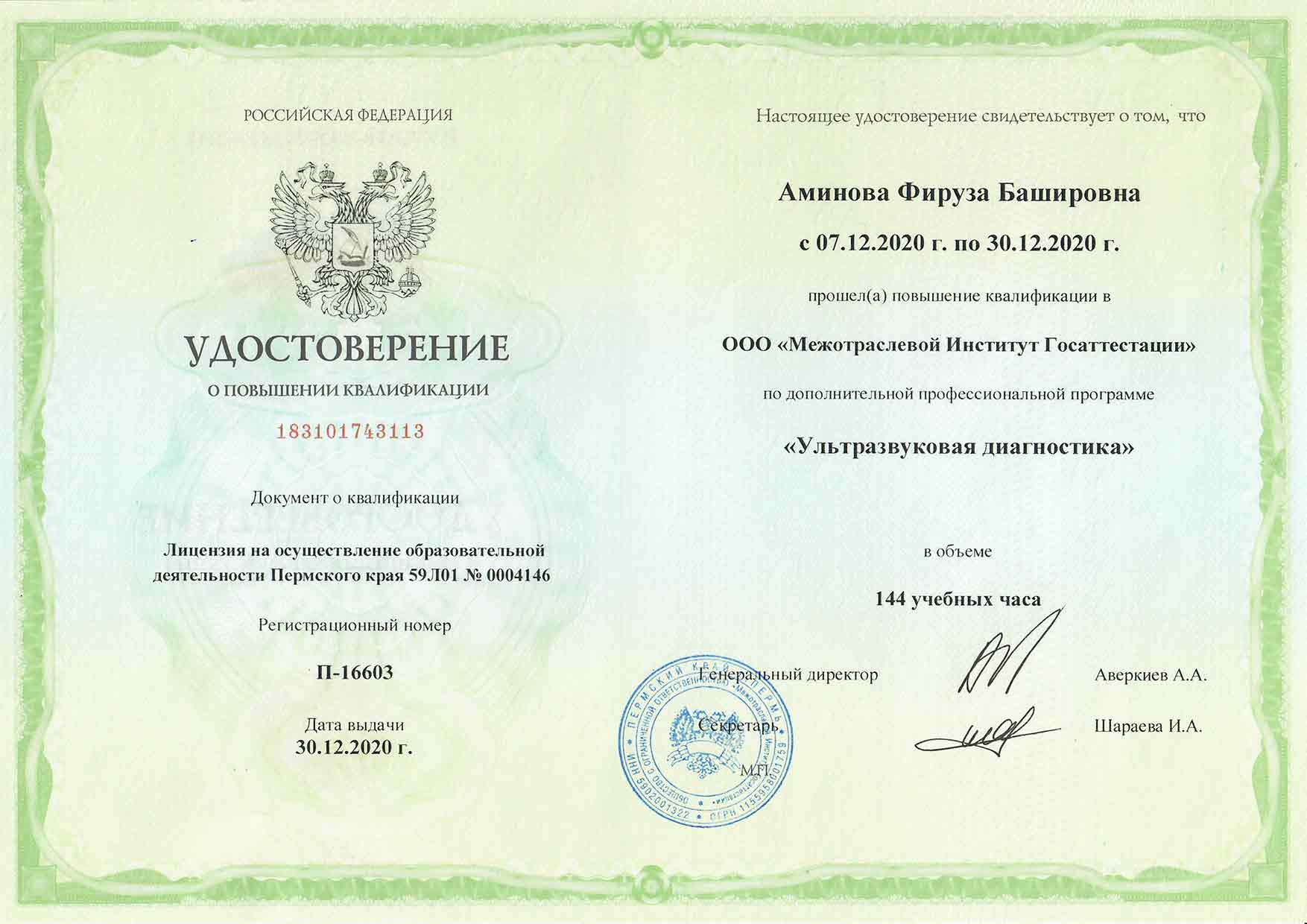 | 2020 г. - ООО "МИГ", повышение квалификации по специальности "Ультразвуковая диагностика" |