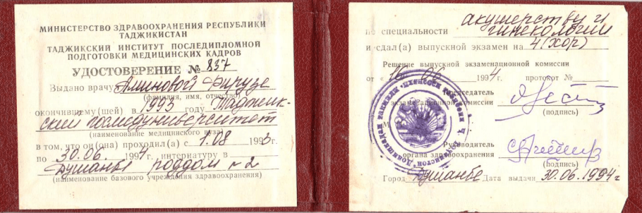| 1994 г. - Интернатура, Роддом №2, Душанбе, специальность "Акушерство и гинекология" |