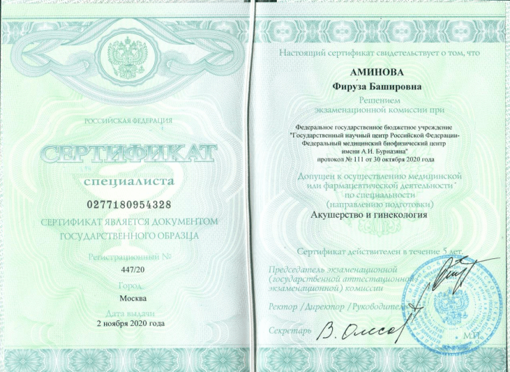 | 2020 г. - Федеральный медицинский биофизический центр имени А.И.Бурназяна, повышение квалификации по специальности "Акушерство и гинекология" |