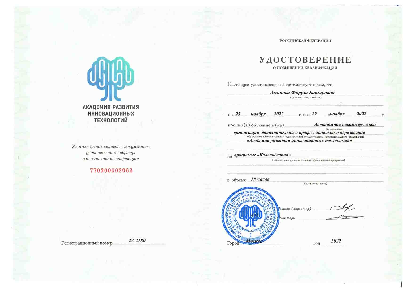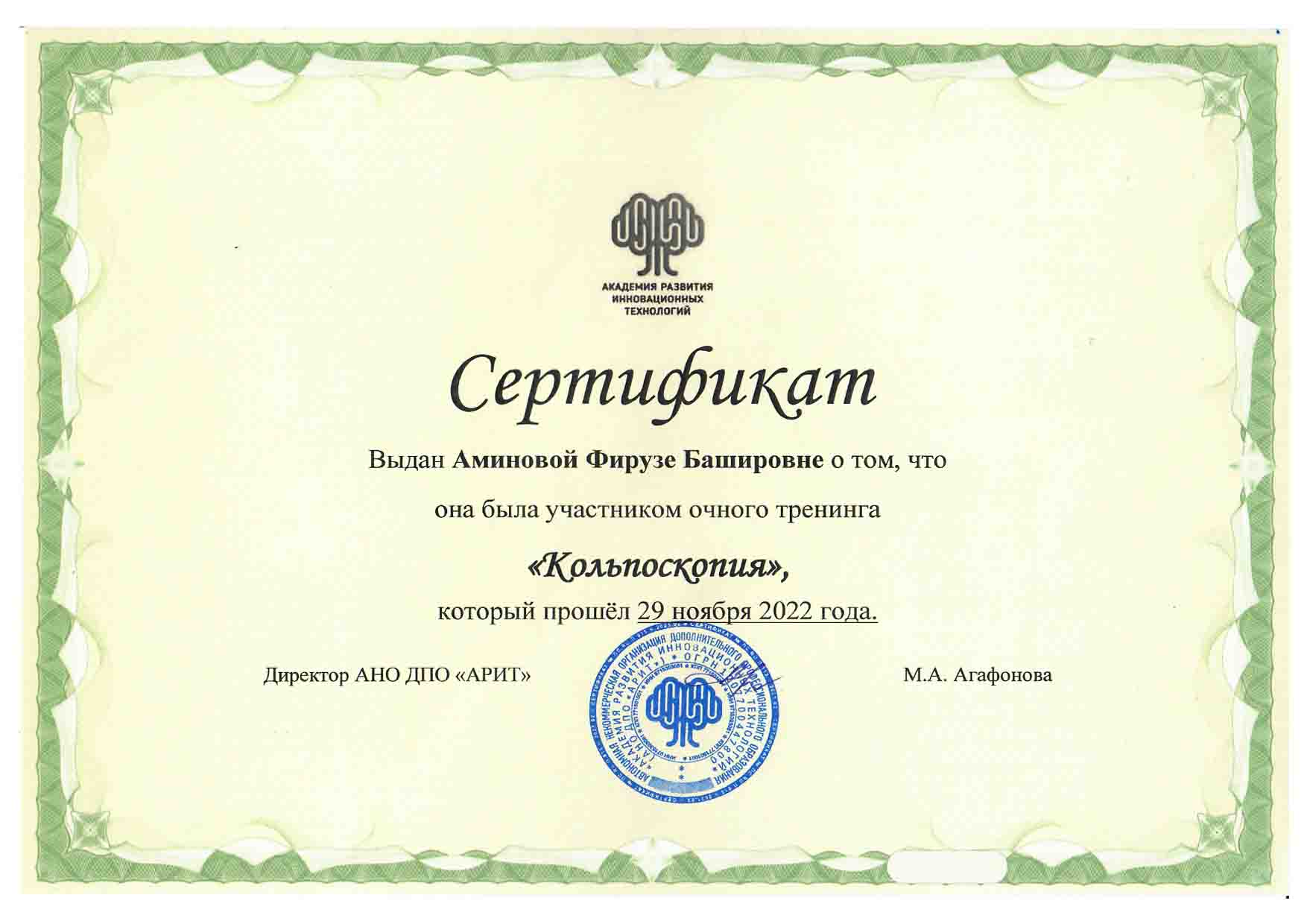 | 2022 г. - АНО ДПО "Академия развития инновационных технологий", повышение квалификации по специальности "Кольпоскопия" |