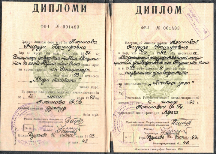| 1993 г. - Таджикский государственный медицинский университет им. Абуали ибн-Сино, специальность "Лечебное дело" |