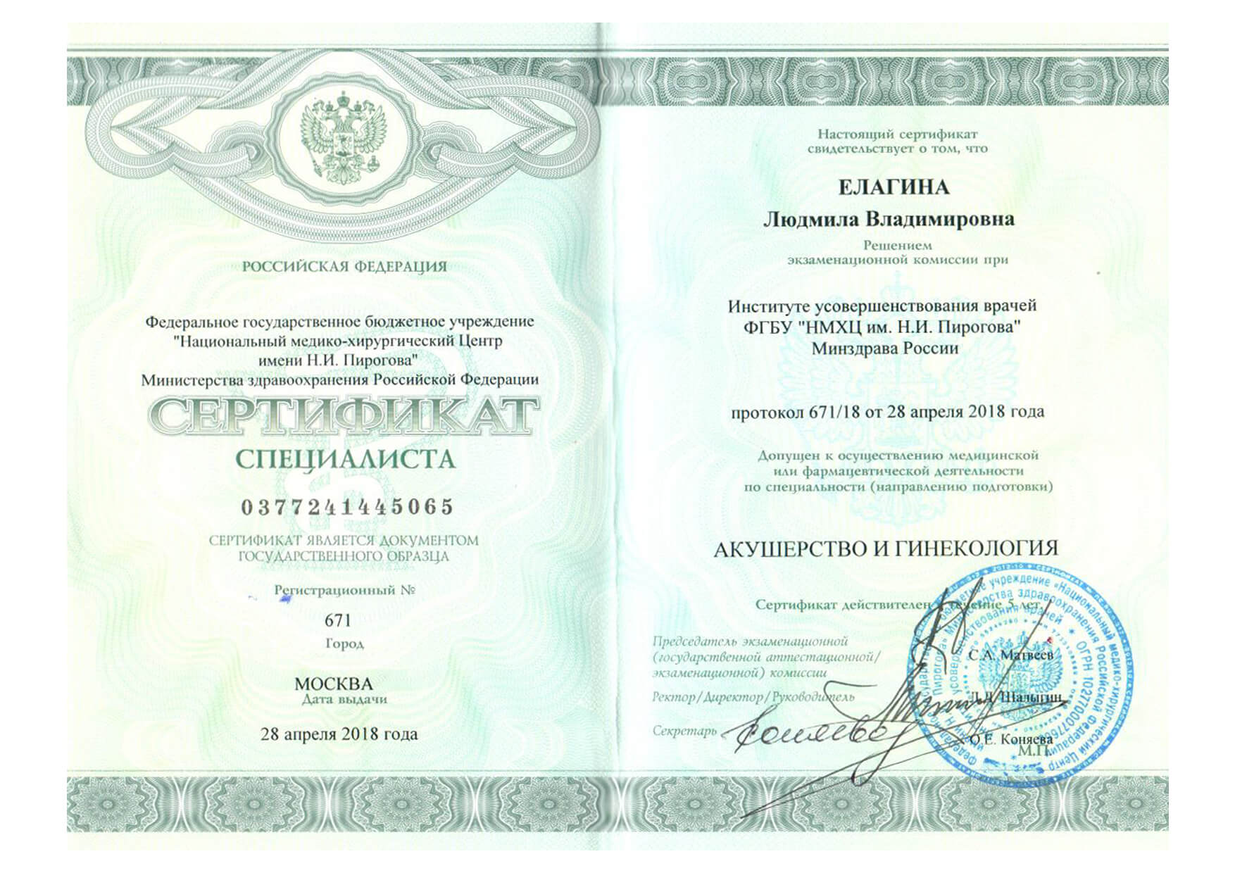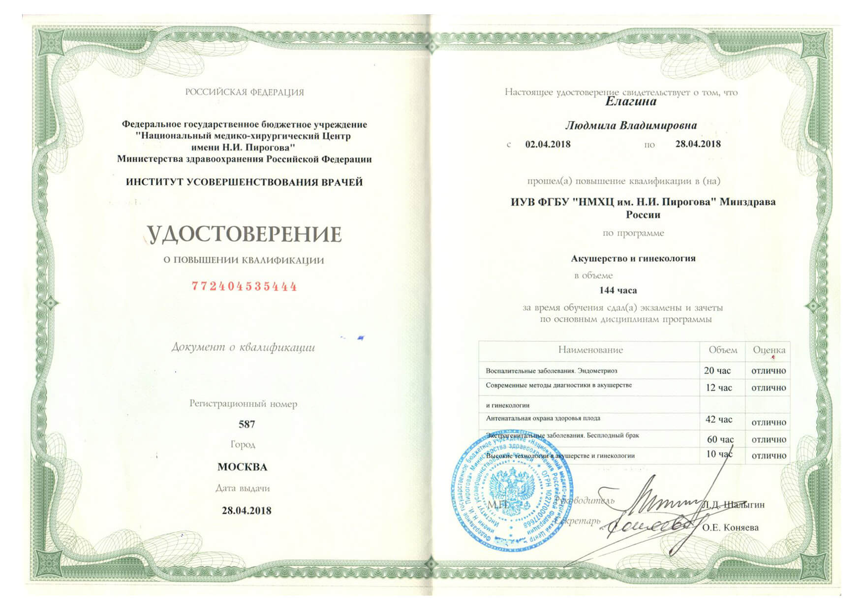 | 2018 г. - ИУВ ФГБУ "НМХЦ им. Н.И. Пирогова" Минздрава России, повышение квалификации по специальности "Акушерство и гинекология" |
