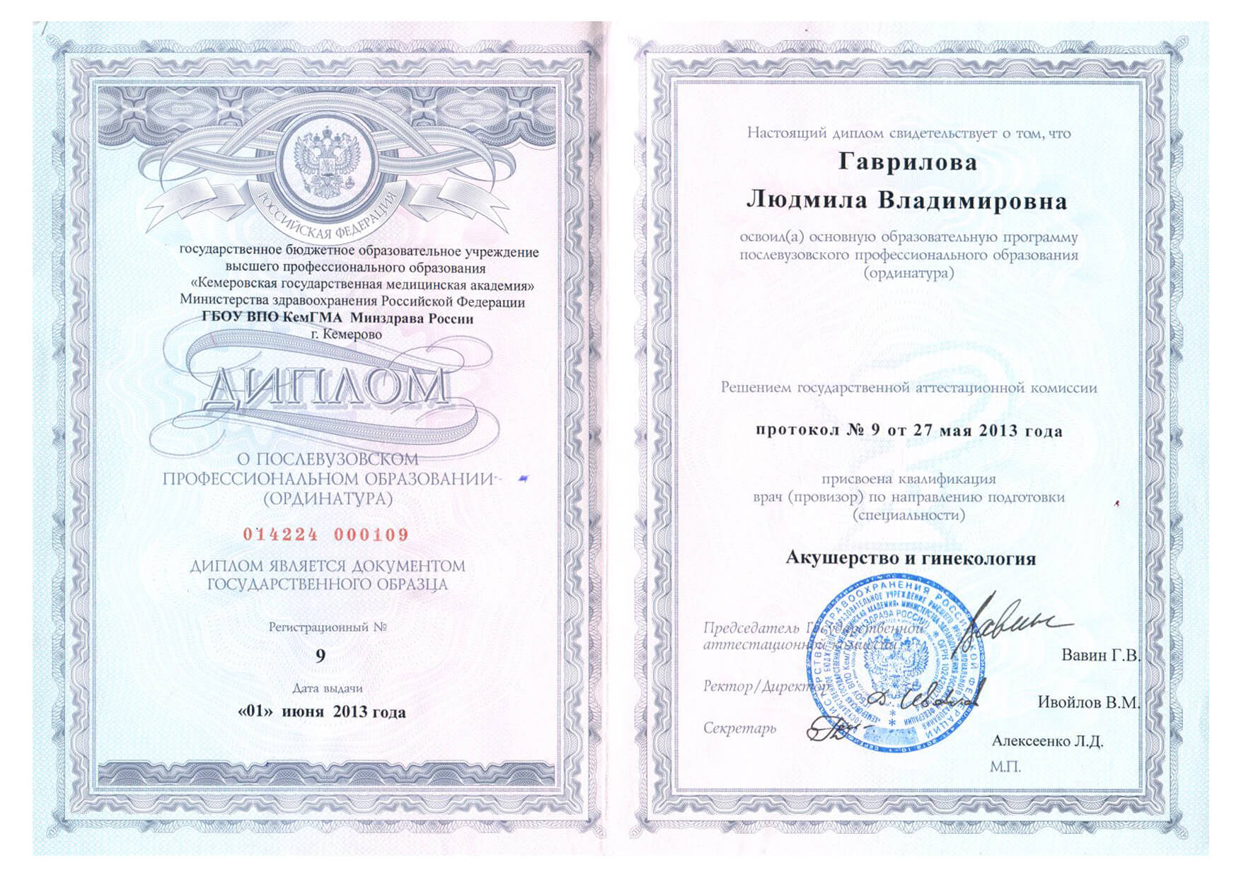 | 2013 г. - Ординатура, ГБОУ ВПО КемГМА Минздрава России, специальность "Акушерство и гинекология" |