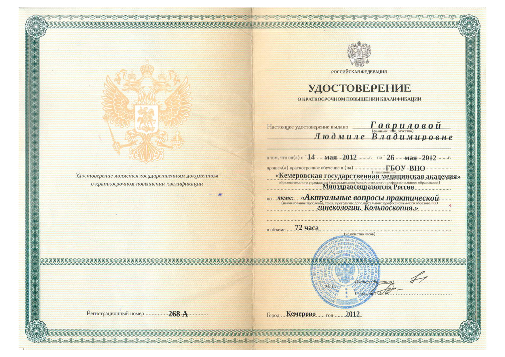 | 2013 г. - Повышение квалификации по специальности "Кольпоскопия" |