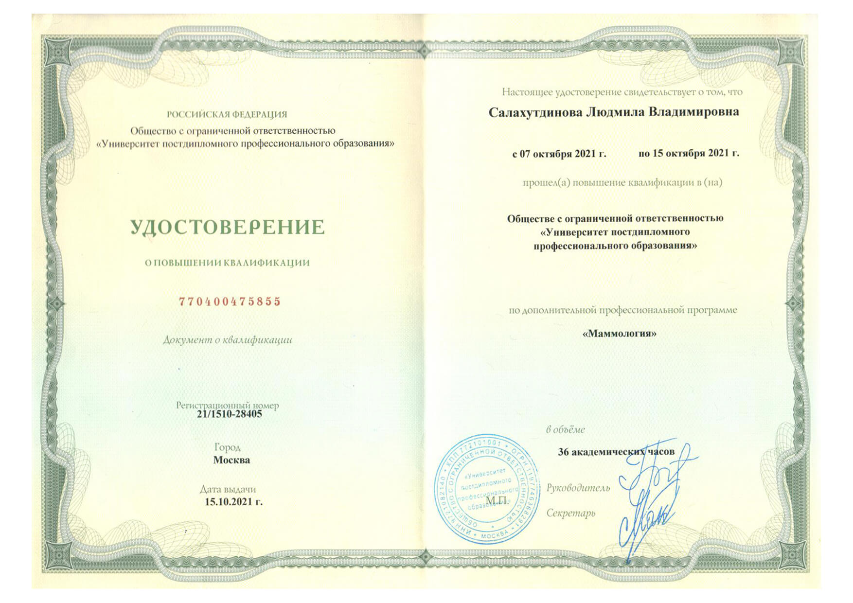 | 2021 г. - ООО "Университет постдипломного профессионального образования", повышение квалификации по ДПО "Маммология" |