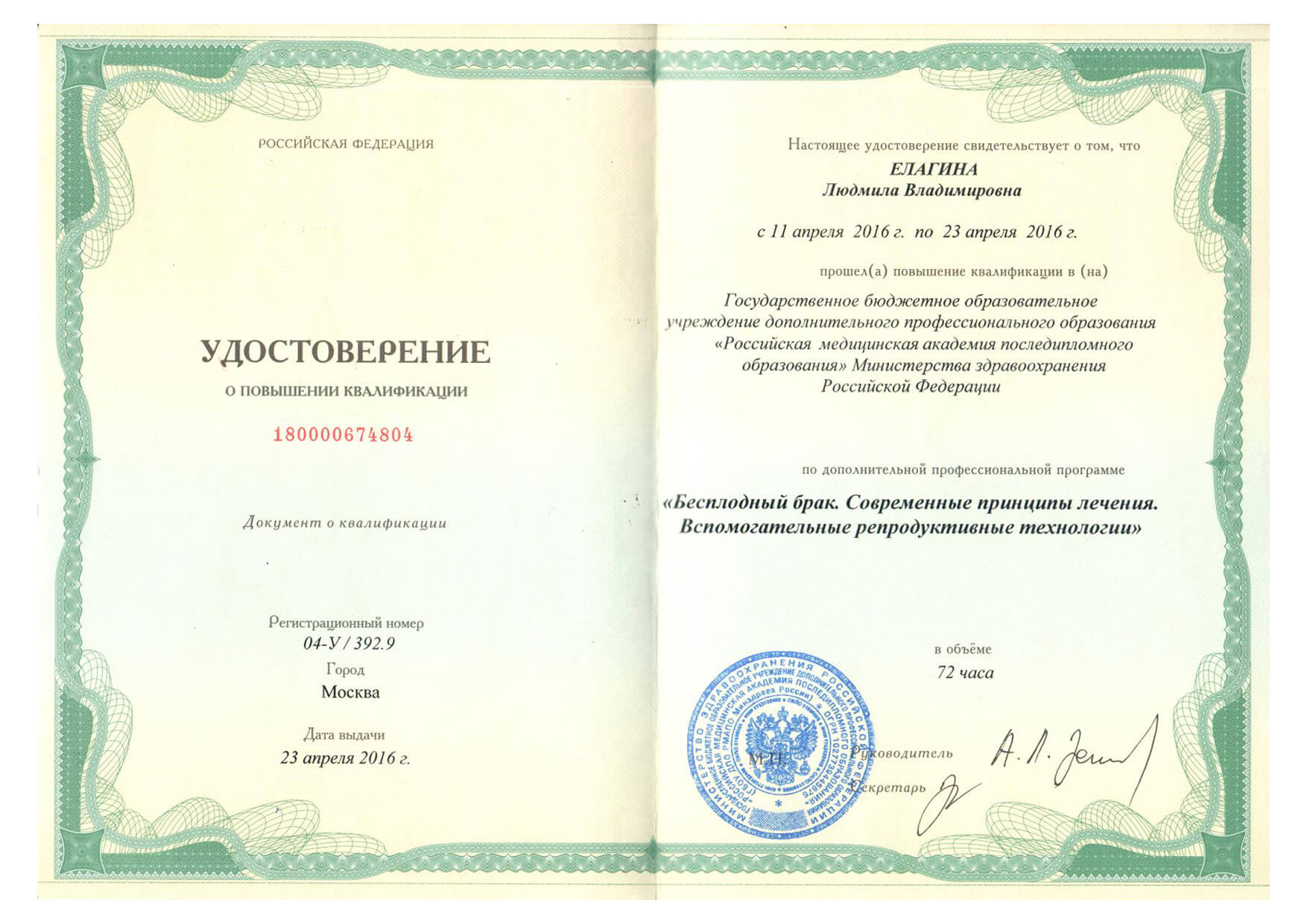 | 2016 г. - ГБОУ ДПО "РМАПО" МЗ РФ, повышение квалификации по программе ДПО "Бесплодный брак. Современные принципы лечения. Вспомогательные репродуктивные технологии" |