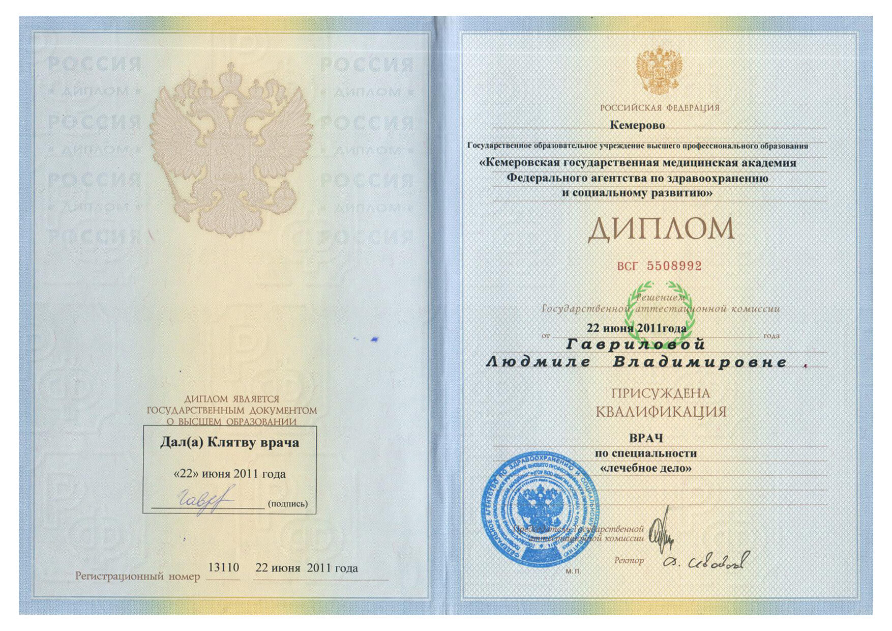 | 2011 г. - Кемеровская государственная медицинская академия Федерального агентства по здравоохранению и социальному развитию, специальность "Лечебное дело" |