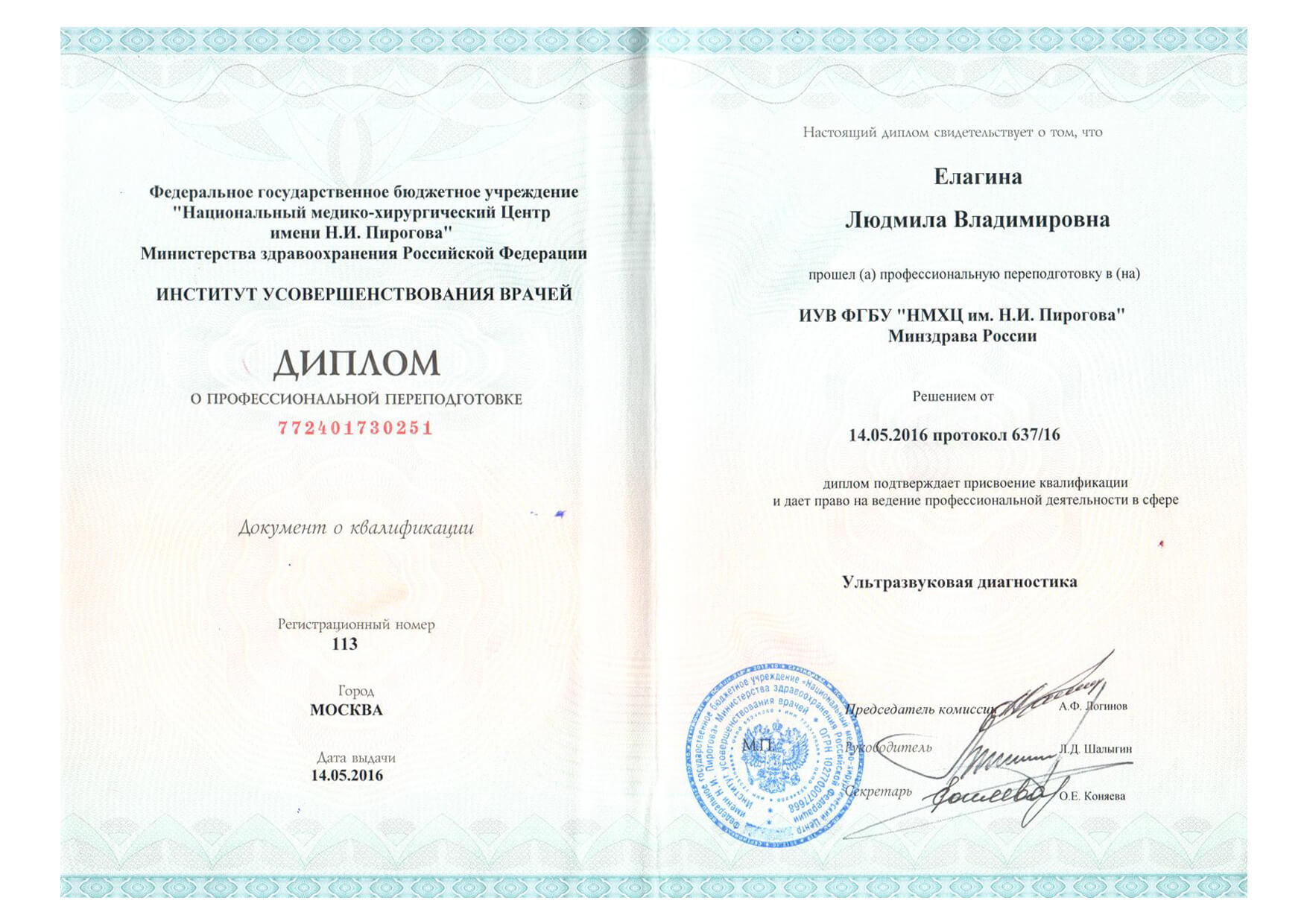 | 2016 г. - ИУВ ФГБУ "НМХЦ им. Н.И. Пирогова" Минздрава России, профессиональная переподготовка по специальности "Ультразвуковая диагностика" |
