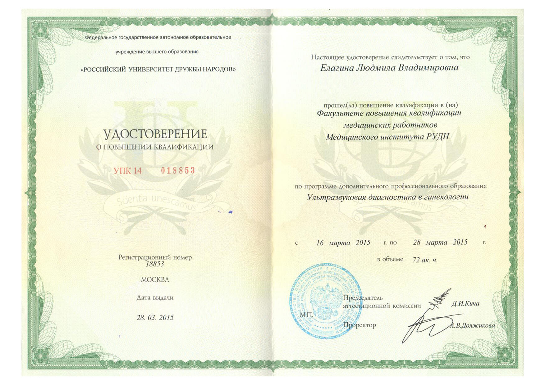 | 2015 г. - Факультет повышения квалификации медицинских работников Медицинского института РУДН, повышение квалификации по программе ДПО "Ультразвуковая диагностика в гинекологии" |
